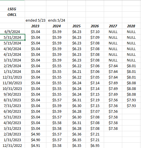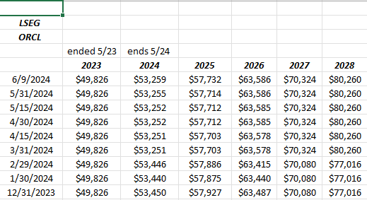 One final thought for readers: I've found over the years, Oracle stock typically peaks between 47% and 50% operating margin. The last three quarters operating margin for Oracle have been 43.6% (2/24 qtr), 42.8% (10/23) and 40.6% (8/23/23 qtr).